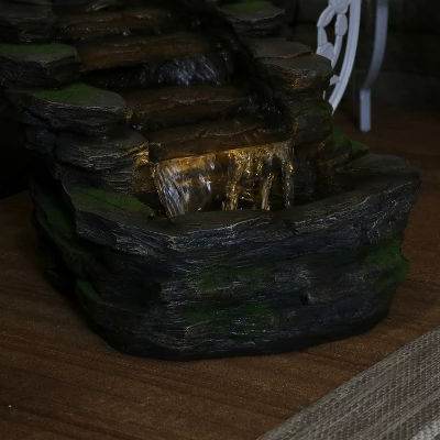Add a touch of nature-inspired beauty to your patio, balcony, or garden with this outdoor water fountain with LED lights for subtle and sweet illumination at night. This realistic fountain mimics the appearance of natural shale rock formations but is made from lightweight yet durable polyresin, so it is easy to move and maintain. This fountain is also durable against the elements outdoors for long-lasting use year after year. This fountain features 5 tiers and creates a relaxing sound as the water cascades from tier to tier in eye-catching waterfalls, before collecting in the bottom basin and circulating again. The water recirculates throughout the fountain thanks to the adjustable flow electric submersible pump. Setting up the fountain is simple with no plumbing installation required. Plus, this fountain is illuminated by warm white LED bulbs, so its beauty is visible even after the sun sets for relaxing evenings and nights.