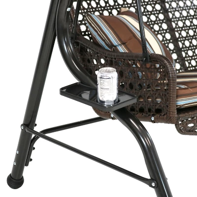 Lean back and enjoy the fresh air in the backyard, patio, or front porch with this comfy, 2-seater, rattan, outdoor covered bench swing featuring striped pillows and curtains for extra style. Featuring attractive earth tones, this outdoor patio canopy swing will make an appealing addition to any lawn or patio. The solid brown canopy complements the neutral-colored stripes of the 2 outdoor throw pillows and single seat cushion. Not only are the canopy, pillows and seat cushion easy to care for, but are also quite durable and comfortable. Friends and family can relax on this swing with confidence knowing that the frame is made of strong steel with a rust-resistant powder-coated finish. The seat frame is made to look like traditional rattan but will stay smooth to the touch and will not splinter. Grab a book, cold drinks, and a friend, and enjoy this beautiful, relaxing patio swing with ease.