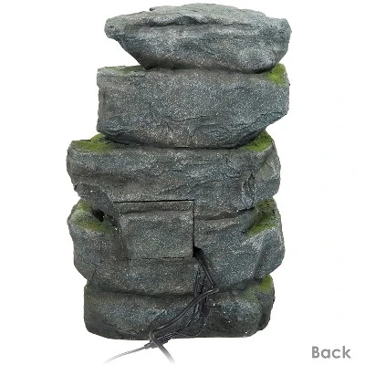 • DURABLE CONSTRUCTION: This outdoor rock water fountain features polyresin and fiberglass construction for added durability. It also conveniently includes two electric cords, one for the lights and one for the pump so you can run both or just one. There are also splash guards in the middle two levels to help prevent cascading water from splashing out.