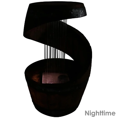 Add vintage style and farmhouse aesthetics to any deck, patio, garden, yard, or other landscaping area with this unique spiraling barrel water fountain featuring LED lights. This impressive fountain boasts beautiful, country chic curves that frame the constant stream of water that falls straight down the middle of this feature. This fountain features a durable resin construction that makes it lightweight so you can easily move it from place to place yet remains durable so it can easily withstand the elements outdoors. Relax to the sounds of water raining down. Once it collects in the bottom, it circulates through the submersible electric pump. Simply plug the fountain into your nearest outlet and relax.