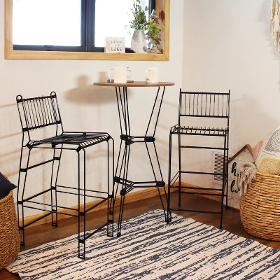 Add a sophisticated bar set to your home while enjoying the airy design of this metal high-top table and chairs set. Place this 2-person bar table set in any kitchen, living room, basement, or cabin bar for an efficient and attractive place to sit and drink with loved ones. Intended for indoor use only, this set makes for great conversational seating options during parties and other events. The table and chairs are built from durable thermoplastic steel wire in black with a clear coating of LDPE to last while remaining lightweight and easy to move anywhere. The tabletop is made from faux woodgrain MDF in an oak finish for added style without the maintenance. Sure to match a variety of indoor locations, the table and chairs also feature plastic leveling feet for added longevity. All assembly hardware needed to put these 3 pieces together are included in the box (please note, a Phillips screwdriver is required to put this table together but is not included).