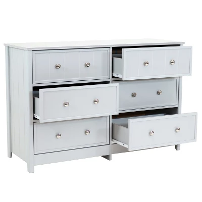 • LONG-LASTING STYLE: Made with durable and smooth MDF material with a gray painted finish and a UV-resistant coating, this six drawer chest features a classic look of real wood without the added maintenance. The silver handles are made with zinc alloy metal while the drawers slide easily on carbon steel sliders. Sure to complement any indoor setting, this dresser is built to last.