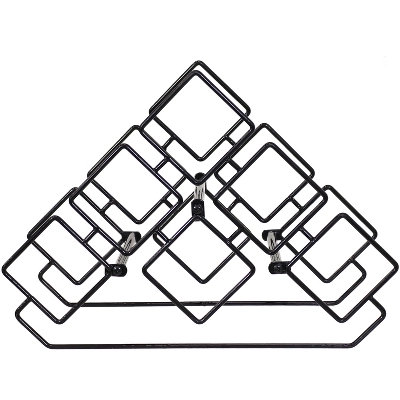 Add function and storage space to your kitchen with this attractive indoor wire bottle holder. This steel wine rack can hold up to 6 bottles of red or white wine to add a convenient yet stylish accent to any area. Place in the kitchen or living room countertop for added ambiance when guests are over. Featuring an elegant black color, this triangular wine rack will complement a variety of indoor settings effortlessly. Made from durable thermoplastic steel wiring with a clear coating of LDPE, this metal wine bottle holder is built to last for years of use while remaining lightweight to easily place anywhere. Designed to be used in indoor spaces only, this rack has all assembly hardware needed included in the box to enjoy right away (please note, a Phillips screwdriver is required to put this freestanding rack together but is not included).