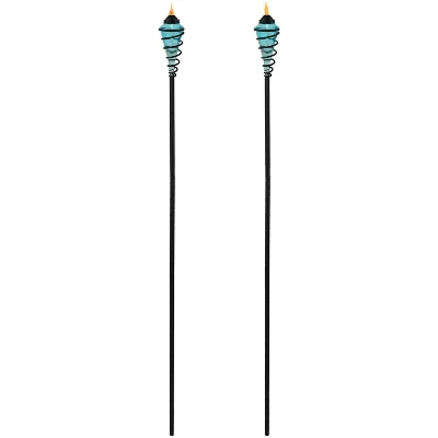This set of torches features beautiful, colored glass fuel containers that are attractively illuminated by torch light. The torches are encased in a metal casing that swirls elegantly for a contemporary or modern look to your backyard or other outdoor setting. Plus, this set of torches includes fiberglass wicks that burn longer than regular wicks so you can keep the night going effortlessly. The fuel containers may be filled with torch or bio ethanol fuel (please note, this set of torches does not come with fuel; fuel must be purchased separately). Safely extinguish the flame on each torch with the included snuffers, which are conveniently attached to each torch by a chain. The set also includes ground stakes and deck clamps, providing the option to use them in the yard or on the deck rails. The stakes also ensure that these torches will never blow away or easily fall down in harsh weather.