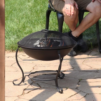 Enjoy backyard, summer bonfires well into the night with this grand, steel, raised fire pit with a spark screen, fire poker, and stand. The fire bowl and spark screen are made of black steel, while the stand is made from iron for strength and resistance to the elements outdoors, ensuring years of long-lasting use. The included wood grate and mesh construction of the spark screen help promote airflow for an optimal fire. The fire pit also features a drainage hole for easy maintenance. The small, raised design of the fire pit makes it compact and easy to take to the campground, have in the backyard, or use at the cabin. Use the included fire pit poker to adjust the logs as needed to keep the fire going. The included poker can also be used to safely lift the spark screen off the fire pit to add more logs to the fire. Place the spark screen back over the fire to keep embers and ash contained.