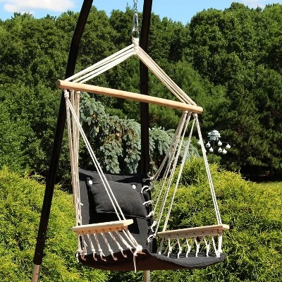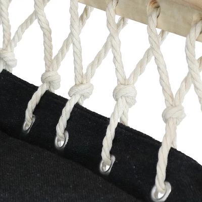 • GOOD QUALITY: The seat and hanging ropes on this hammock swing feature a polyester cover with a polyester fiber filling in a neutral shade of dark gray. It also features a sturdy birch hardwood spreader bar.