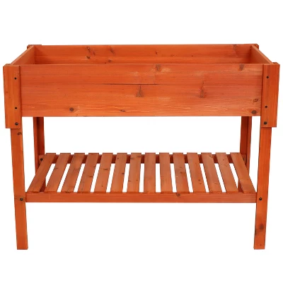 Grow herbs, flowers, vegetables and other beautiful, delectable greens on the deck or patio with this elevated, wooden garden planter bed. Imagine having fresh herbs readily at hand in the kitchen or fresh tomatoes right outside the back door. Easily keep gardening tools and supplies nearby with the handy lower shelf. The garden planter is finished with a protective coat for long-lasting use outdoors. Featuring a beautiful, light stain, a tall stance, a wide basin for planting, and plenty of room beneath the bed for storing necessary tools (or even more plants if potted), this raised garden planter bed is a wonderful piece to unleash your inner green thumb. Beautifully constructed, this piece is sure to complement any patio, deck, garden, or yard with its natural, clean finish. Available in multiple colors, this garden bed is a great addition to any outdoor space and, a great way to have fresh, delicious greens and veggies in your fridge all grown by you!