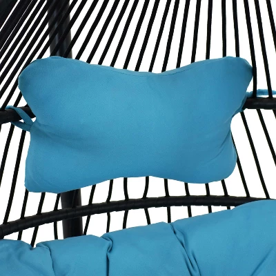 Create a wonderful place to relax with the Sunnydaze Julia hanging egg chair with stand and cushion. This comfortable and cool hanging wicker chair with stand is a stylish addition to any patio, deck, or front porch. It is great for reading, chatting with friends, or simply relaxing after a long day. This chair’s seat and frame are made from steel wrapped with durable and weather-resistant polyethylene rattan. Unlike natural rattan, synthetic rattan wicker is smooth to the touch and can’t produce splinters. This chair also features a polyester rope back and includes plush cushions in rich jewel tones for extra comfort. Plus, the headrest pillow can easily be fastened to the frame using the attached fabric ties. With the sturdy steel stand, this egg patio chair can be placed anywhere without having to drill holes in the ceiling. The stand features a U-shaped base for extra stability and has a durable, power-coated black finish to complement any decor.